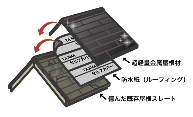 屋根カバー工法(重ね葺き)とは、既存の屋根材をはがさずに、その上から新しい屋根材を重ねて施工する工法です。「重ね葺き」「カバー工法」「重ね張り」などとも呼ばれます。