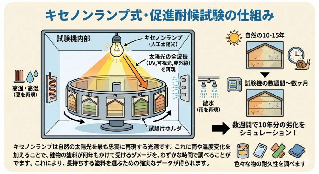 促進耐候試験(キセノンランプ式)とは——4,000時間=10年の意味