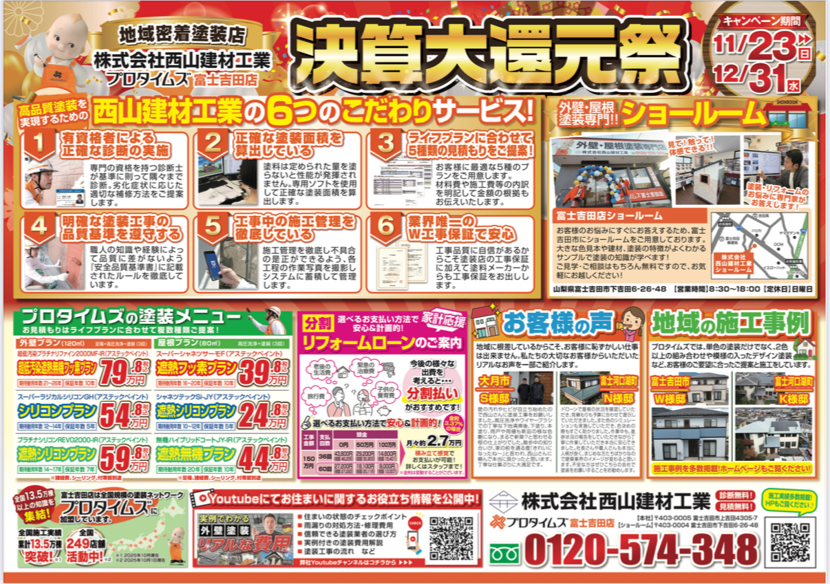 富士吉田市の外壁・屋根塗装専門店、**株式会社西山建材工業(プロタイムズ富士吉田店)**です。