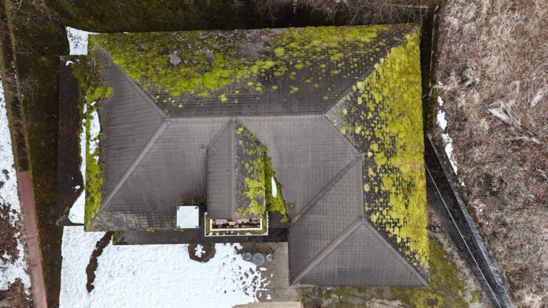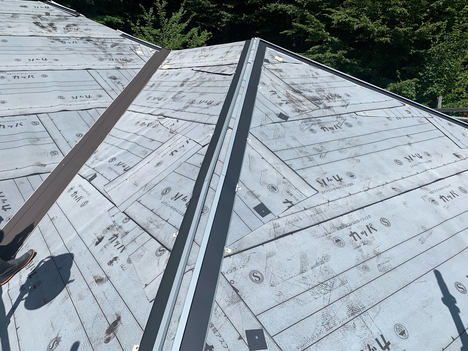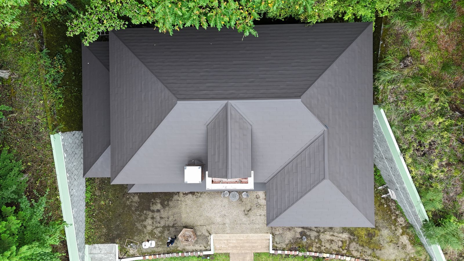 既存の屋根材はアスファルトシングルで、約30年間ノーメンテナンス。苔の繁殖や全体的な防水性能の低下が確認されました。塗装では十分な耐久性が見込めないため、ガルバリウム鋼板【GMルーフ】でのカバー工法(色:コゲチャ)をご提案しました。