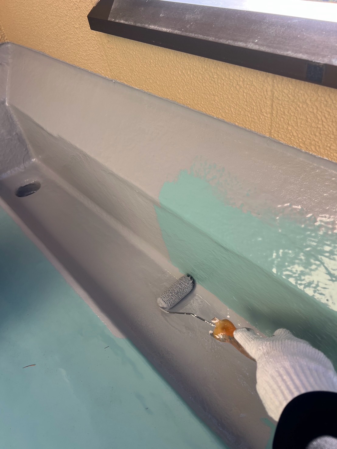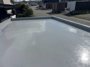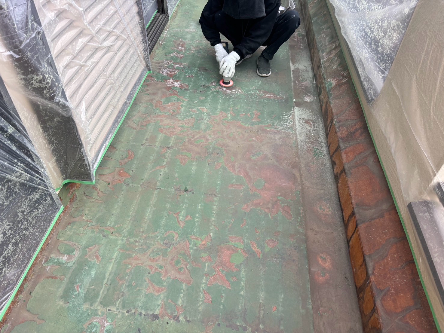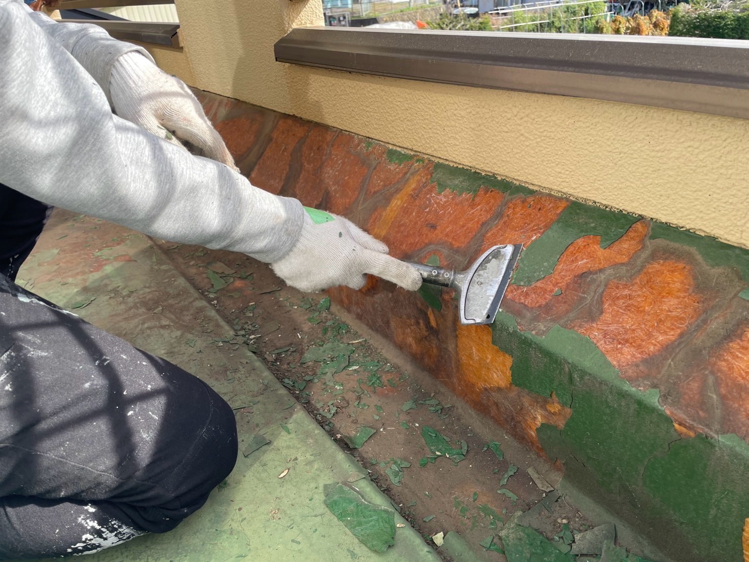 確認したところ、既存の FRP防水が大きく剥がれて “ベロベロ” と浮いている状態で、